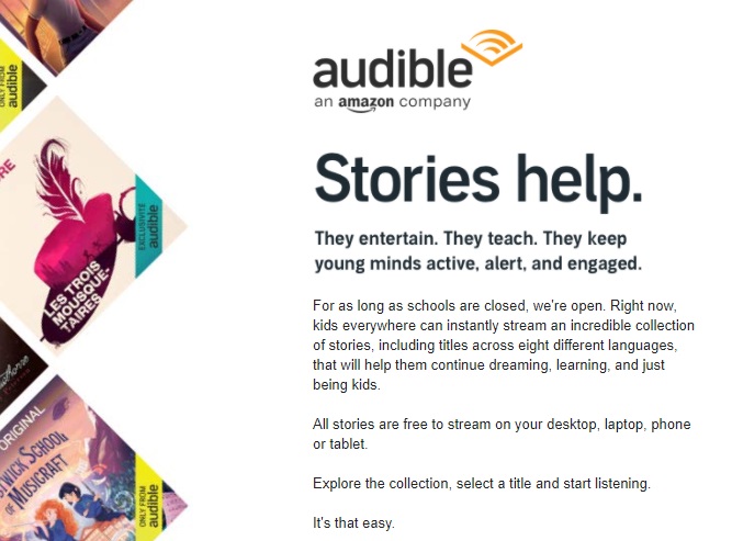 So, naturally, with my love of audiobooks would come a membership with Audible. I joined Audible back in 2011 and currently have 620 titles in my library, although I haven’t listed to all of those just yet. Over the past 9 months, Audible has been doing some pretty cool stuff due, specifically, to the pandemic which has kept many of us on lockdown in our homes. Early on and still today, they offer a slew of childrens audiobooks covering a wide span of ages and in 8 different languages, to help both kids & parents stuck at home looking for new sources for entertainment, education and shared experiences.