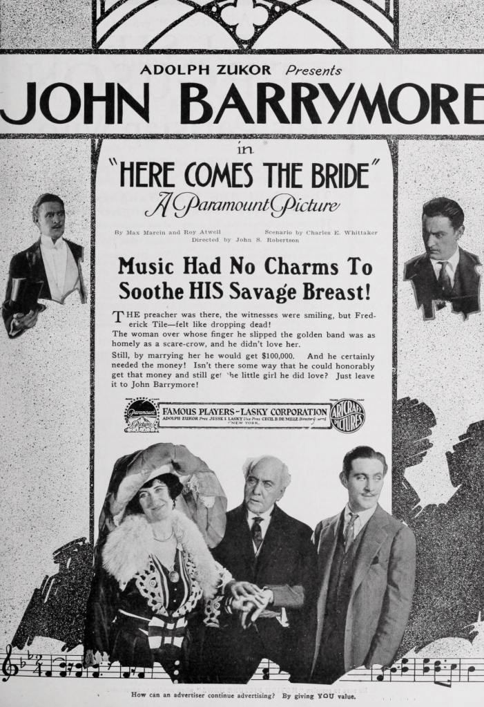 Barrymore focused on his stage career until 1914, when he made his first feature film appearance in An American Citizen in which he reportedly delighted audiences with his “light touch” in the romantic comedy. Then, in 1919, he appeared in the film adaptation of the Broadway play Here Comes the Bride followed by his highly successful turn in the dual roles of Dr. Jekyll and Mr. Hyde in the 1920 film.